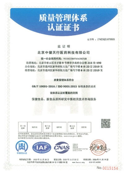 2023年11月20日,北京中健天行醫(yī)藥科技有限公司順利通過ISO9001質(zhì)量管理體系認(rèn)證,認(rèn)證范圍為保健食品、新食品原料研發(fā)申報兩大主營業(yè)務(wù),成為北京地區(qū)率先獲得該認(rèn)證的研發(fā)申報服務(wù)商。