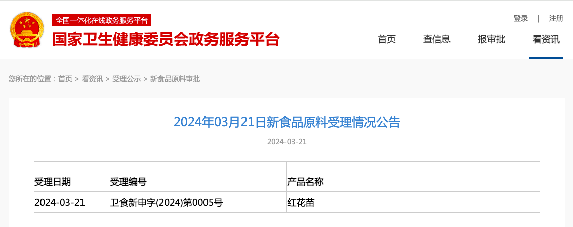 2024年3月21日,企業(yè)委托我司申報的“紅花苗”已正式獲得國家衛(wèi)健委的受理,受理編號:衛(wèi)食新申字(2024)第0005號。整個申報過程歷時1年多,經(jīng)歷了前期審議、樣品檢驗(包括成分分析、衛(wèi)生學、毒理學及安全性評估等)、材料遞交以及形式審查等環(huán)節(jié)。接下來,我們將按照國家衛(wèi)健委的要求進行技術評審、現(xiàn)場答辯并補充必要的意見,全力以赴推進項目申報進程。