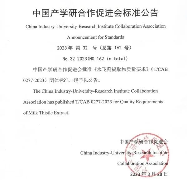近日,為提升水飛薊提取物原料質(zhì)量及相關(guān)產(chǎn)品品質(zhì),促進(jìn)營(yíng)養(yǎng)健康產(chǎn)業(yè)高質(zhì)量發(fā)展,中國(guó)產(chǎn)學(xué)研合作促進(jìn)會(huì)正式發(fā)布《水飛薊提取物質(zhì)量要求》(T/CAB 0277-2023)團(tuán)體標(biāo)準(zhǔn),該標(biāo)準(zhǔn)將水飛薊提取物質(zhì)量劃分為“優(yōu)質(zhì)”和“合格”兩個(gè)等級(jí),在特征性成分水飛薊素含量標(biāo)準(zhǔn)上,首次提出優(yōu)質(zhì)等級(jí)的水飛薊提取物應(yīng)符合40.0%—65.0%含量要求;針對(duì)合格等級(jí)的水飛薊提取物,則在歐洲藥典、英國(guó)藥典水飛薊素含量30.0%—65.0%的質(zhì)量要求基礎(chǔ)上,對(duì)微生物限量、溶劑殘留等部分指標(biāo)項(xiàng)做了更嚴(yán)苛的限定。
