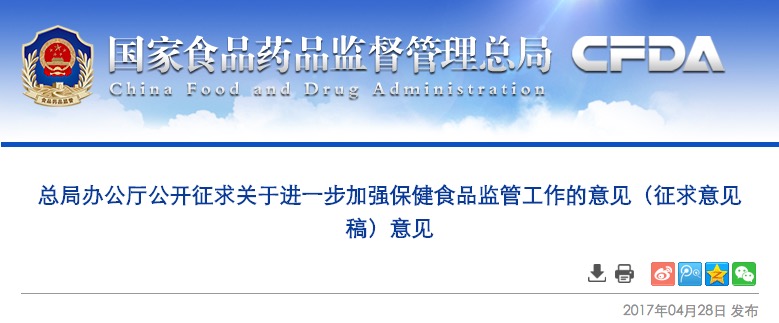 為全面貫徹落實(shí)黨中央、國務(wù)院“四個(gè)最嚴(yán)”“放管服”的要求,進(jìn)一步加強(qiáng)保健食品監(jiān)管工作,保障人民群眾“舌尖上的安全”,我局研究起草了《關(guān)于進(jìn)一步加強(qiáng)保健食品監(jiān)管工作的意見(征求意見稿)》(附件1),現(xiàn)公開向社會(huì)征求意見和建議。請于2017年5月12日前,填寫意見反饋表(附件2),以電子郵件形式反饋。