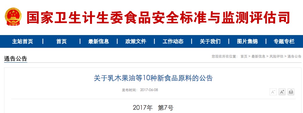 根據(jù)《食品安全法》規(guī)定,審評(píng)機(jī)構(gòu)組織專家對(duì)乳木果油等10種新食品原料的安全性評(píng)估材料審查并通過(guò)。