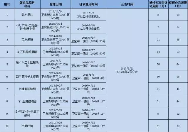 2017年6月13日,時隔兩年,國家衛(wèi)計委公告10種新食品原料,我司對此次公告的10種新食品原料申報周期進(jìn)行了分析(詳見下表),從獲得受理到批準(zhǔn)公告最短周期為14個月,最長84個月,平均42.5個月。另外,企業(yè)獲得受理前須完成成分分析、衛(wèi)生學(xué)、急性經(jīng)口毒性、三項(xiàng)遺傳毒性、90天經(jīng)口毒性、致畸、安全性評估意見等報告及資料,也需要很長時間。