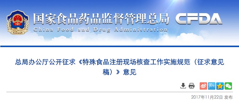 為規(guī)范特殊食品注冊(cè)現(xiàn)場(chǎng)核查工作,加強(qiáng)特殊食品注冊(cè)管理,根據(jù)《中華人民共和國(guó)食品安全法》《保健食品注冊(cè)與備案管理辦法》《嬰幼兒配方乳粉品種配方注冊(cè)管理辦法》《特殊醫(yī)學(xué)用途配方食品注冊(cè)管理辦法》等相關(guān)規(guī)定,國(guó)家食品藥品監(jiān)督管理總局起草了《特殊食品注冊(cè)現(xiàn)場(chǎng)核查工作實(shí)施規(guī)范(征求意見(jiàn)稿)》?,F(xiàn)向社會(huì)公開(kāi)征求意見(jiàn),請(qǐng)于2017年12月5前將有關(guān)意見(jiàn)和建議以電子郵件形式反饋至國(guó)家食品藥品監(jiān)督管理總局特殊食品注冊(cè)管理司。