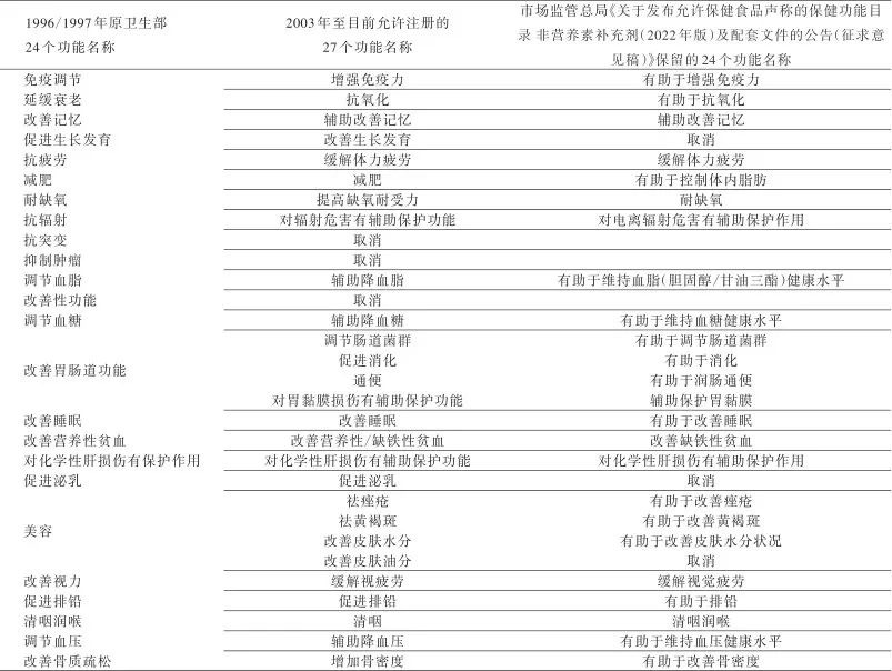2018年3月,我國政府機(jī)構(gòu)職能再次調(diào)整,原國家食藥總局、國家工商行政管理總局和國家質(zhì)量監(jiān)督檢驗(yàn)檢疫總局并入新組建的國家市場(chǎng)監(jiān)督管理總局。2019年8月,國家市場(chǎng)監(jiān)督管理總局發(fā)布了《保健食品原料目錄與保健功能目錄管理辦法》[18],其中規(guī)定由國家市場(chǎng)監(jiān)督管理總局會(huì)同國家衛(wèi)生健康委員會(huì)、國家中醫(yī)藥管理局制定、調(diào)整并公布保健食品原料目錄和保健功能目錄;國家市場(chǎng)監(jiān)督管理總局食品審評(píng)機(jī)構(gòu)負(fù)責(zé)組織擬訂保健功能目錄,接收納入或者調(diào)整保健功能目錄的建議;任何單位或者個(gè)人在開展相關(guān)研究的基礎(chǔ)上,可以向?qū)徳u(píng)機(jī)構(gòu)提出擬納入或者調(diào)整保健功能目錄的建議。在保健功能調(diào)整和功能學(xué)評(píng)價(jià)方法的修訂方面,2019年3月市場(chǎng)監(jiān)管總局發(fā)布關(guān)于征求調(diào)整保健食品保健功能意見的公告[6],將現(xiàn)有27個(gè)保健功能和原來(原衛(wèi)生部早期)曾經(jīng)批過個(gè)別產(chǎn)品的18個(gè)功能分為三類:首批擬調(diào)整功能聲稱表述的保健功能(18個(gè)),擬取消的保健功能(3+18個(gè))和有待進(jìn)一步研究論證的保健功能(6個(gè))。經(jīng)兩次征求意見匯總處理后,市場(chǎng)監(jiān)管總局又再次于2022年1月12日發(fā)布關(guān)于公開征求《關(guān)于發(fā)布允許保健食品聲稱的保健功能目錄 非營(yíng)養(yǎng)素補(bǔ)充劑(2022年版)及配套文件的公告(征求意見稿)》意見的公告[19],保留了現(xiàn)有27個(gè)功能中的24個(gè)(并增加了相應(yīng)的“保健功能釋義”),取消了改善生長(zhǎng)發(fā)育、促進(jìn)泌乳和改善皮膚油分3個(gè)功能。我國保健食品功能名稱的變化見表1。