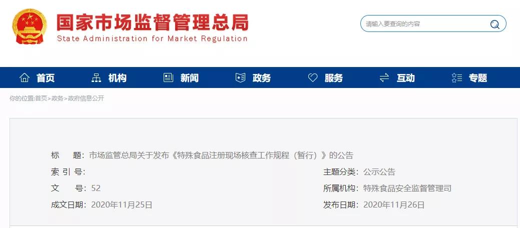 為規(guī)范特殊食品注冊(cè)現(xiàn)場(chǎng)核查工作,依據(jù)《中華人民共和國(guó)食品安全法》《保健食品注冊(cè)與備案管理辦法》《嬰幼兒配方乳粉產(chǎn)品配方注冊(cè)管理辦法》《特殊醫(yī)學(xué)用途配方食品注冊(cè)管理辦法》等法律規(guī)章,市場(chǎng)監(jiān)管總局制定了《特殊食品注冊(cè)現(xiàn)場(chǎng)核查工作規(guī)程(暫行)》,現(xiàn)予發(fā)布,自公布之日起施行。
