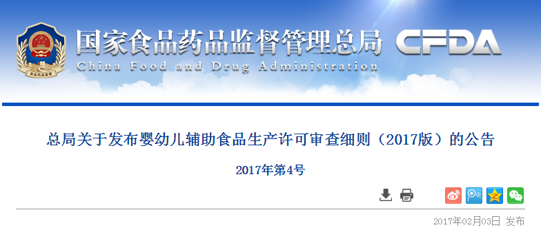 為做好嬰幼兒輔助食品生產許可審查工作,規(guī)范嬰幼兒輔助食品生產加工活動,根據《中華人民共和國食品安全法》及其實施條例、《食品生產許可管理辦法》(國家食品藥品監(jiān)督管理總局令第16號)等有關規(guī)定,國家食品藥品監(jiān)督管理總局組織制定了《嬰幼兒輔助食品生產許可審查細則》(2017版),現(xiàn)予發(fā)布,自發(fā)布之日起施行。